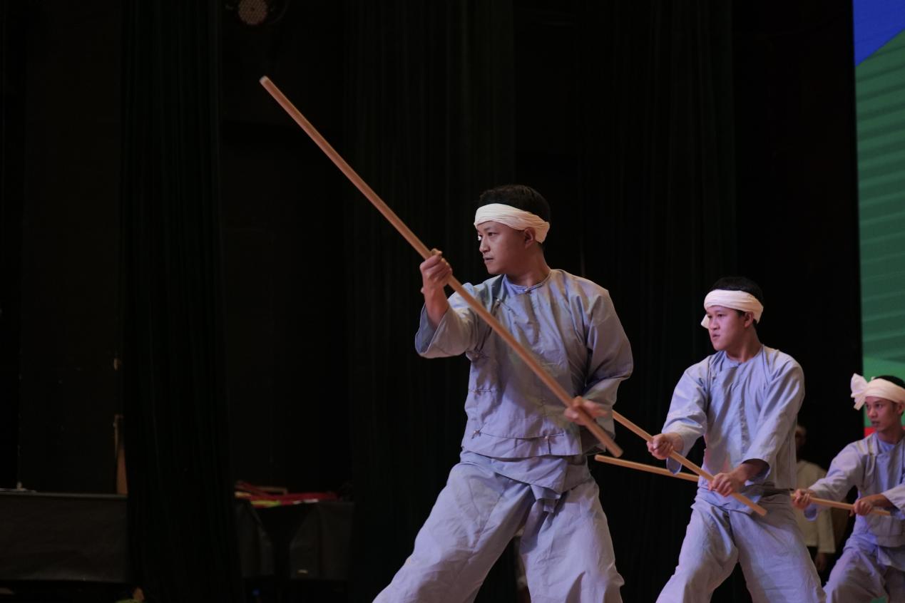 第二项活动由临沧地区耿马县文化馆/民族文化工作队(文艺演出团队)与公司威廉希尔williamhill、舞蹈公司员工共同表演,由王峰主持。首先是傣族古乐舞,由演出团队成员安芒、俸玉款、李学琴、普丽花等人进行乐舞表演,由能底、岩细、俸文杰进行器乐伴奏。第二个节目耿马傣族鼓语由李波、岩依、岩平、依帐等人共同表演,主持人王峰简要介绍耿马傣族及其使用的三种傣文、乐器,以及耿马音乐舞蹈,充分展示当地傣族文化的丰富多彩。演出活动中,耿马傣族同胞向现场观众介绍神兽之舞,并教授象脚鼓鼓语,全场观众热情回应,争先恐后回答问题,全场气氛热烈,满堂欢声笑语。紧接着,由俸小美、叶弄、尹夜、砍润、刀永新等团队成员先后带来蝴蝶舞、紧那罗、傣族传统武术,现场掌声雷鸣。最后,由李志明、相农、引少等成员为观众带来原创舞蹈节目“舞刀少年”“南西米”“马鹿舞”。表演嘉宾与云艺学子们共同呈现了一场精彩纷呈的演出,现场高潮迭起,掌声经久不息。教学展演在快乐与期许中落下帷幕,民族音乐文化所带来的震撼深深烙印在每位观看演出的人心中。