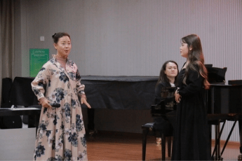 林含霏同学演唱的《蝶恋花·槛菊愁烟兰泣露》,在此过程中王硕教授指出:演唱古诗词的歌曲要注意声音的稳定性,因其词和曲都充满相对的时空感,演唱前要了解作品的创作背景。随后王硕教授对其一字一句的示范教授,详细分析了每一个字的情感表达,王硕教授强调在吸气的同时就把喉咙和硬腭调整到位。