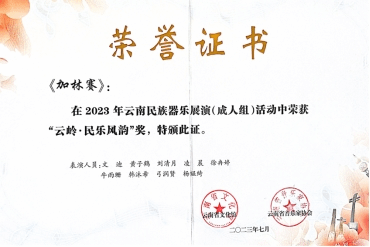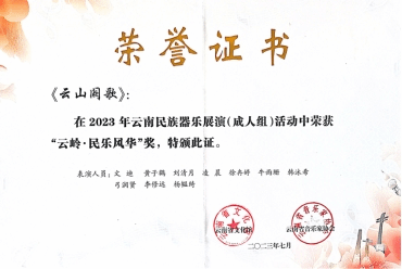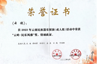 在云南省文化馆与云南省音乐家协会主办的“2023年云南民族器乐展演”中,威廉希尔williamhill国乐系和作曲系教师尹毅、郭乐、高弘扬和赵云龙共同指导的“云上弦歌民族室内乐团”参与比赛并斩获佳绩比赛中,演奏高弘扬作曲的《云山阙歌》《云旎》和邹航编曲、梁聆聆改编的《加林赛》分别荣获成人组“云岭·民乐风华”(一等奖)、“云岭·民乐风雅”(三等奖)和“云岭·民乐风韵”(二等奖)。