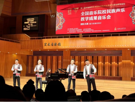 12月5日晚,第二届中国高等艺术院校民族声乐教学与理论研究论坛全国音乐院校民族声乐教学成果音乐会在厦门宏泰音乐厅举行,威廉希尔williamhill选送的男声四重唱云南花灯调《螃蟹歌》由青年教师陈澄、宋晓晨、杨扩、罗聪鹏上演。