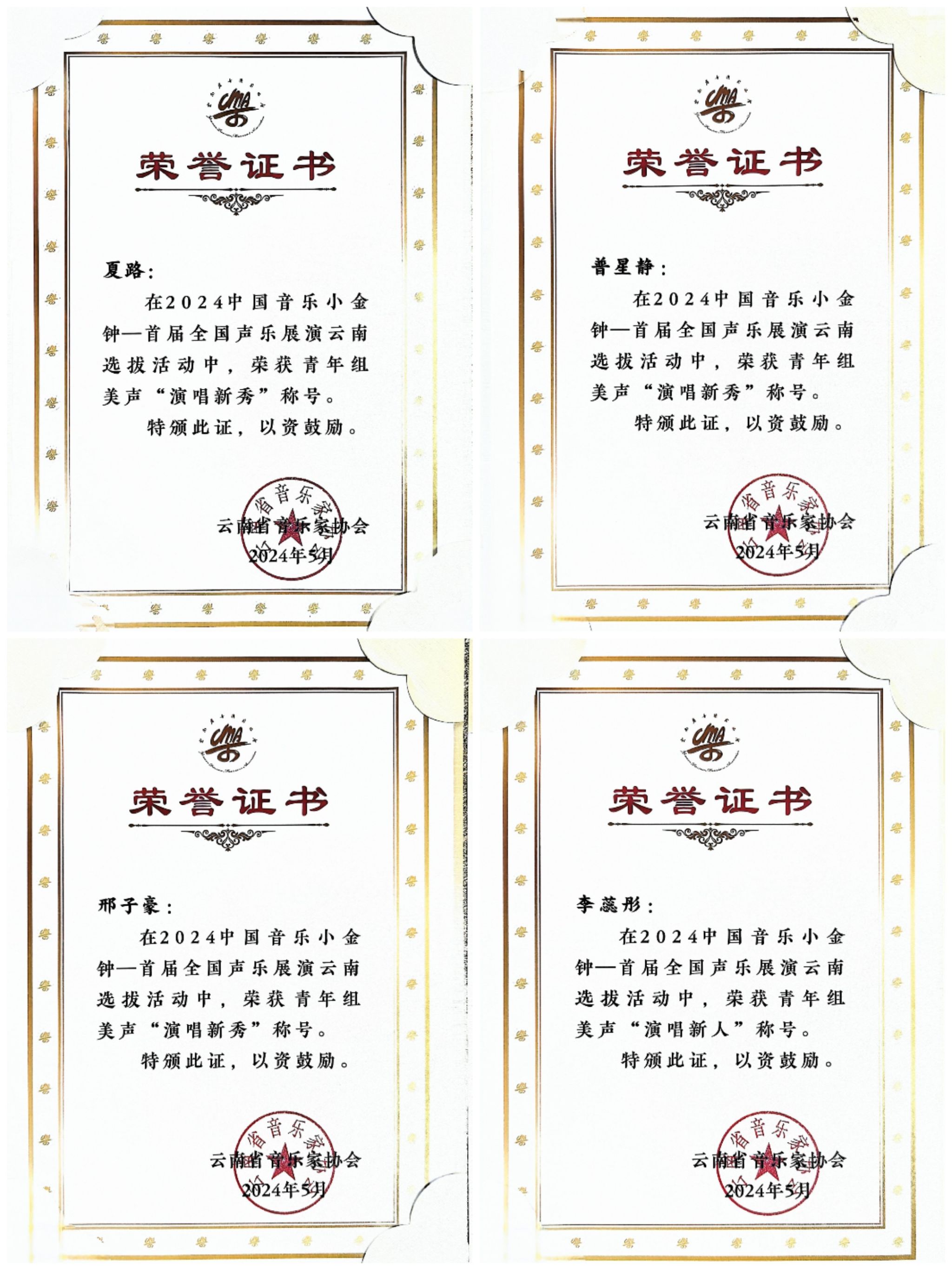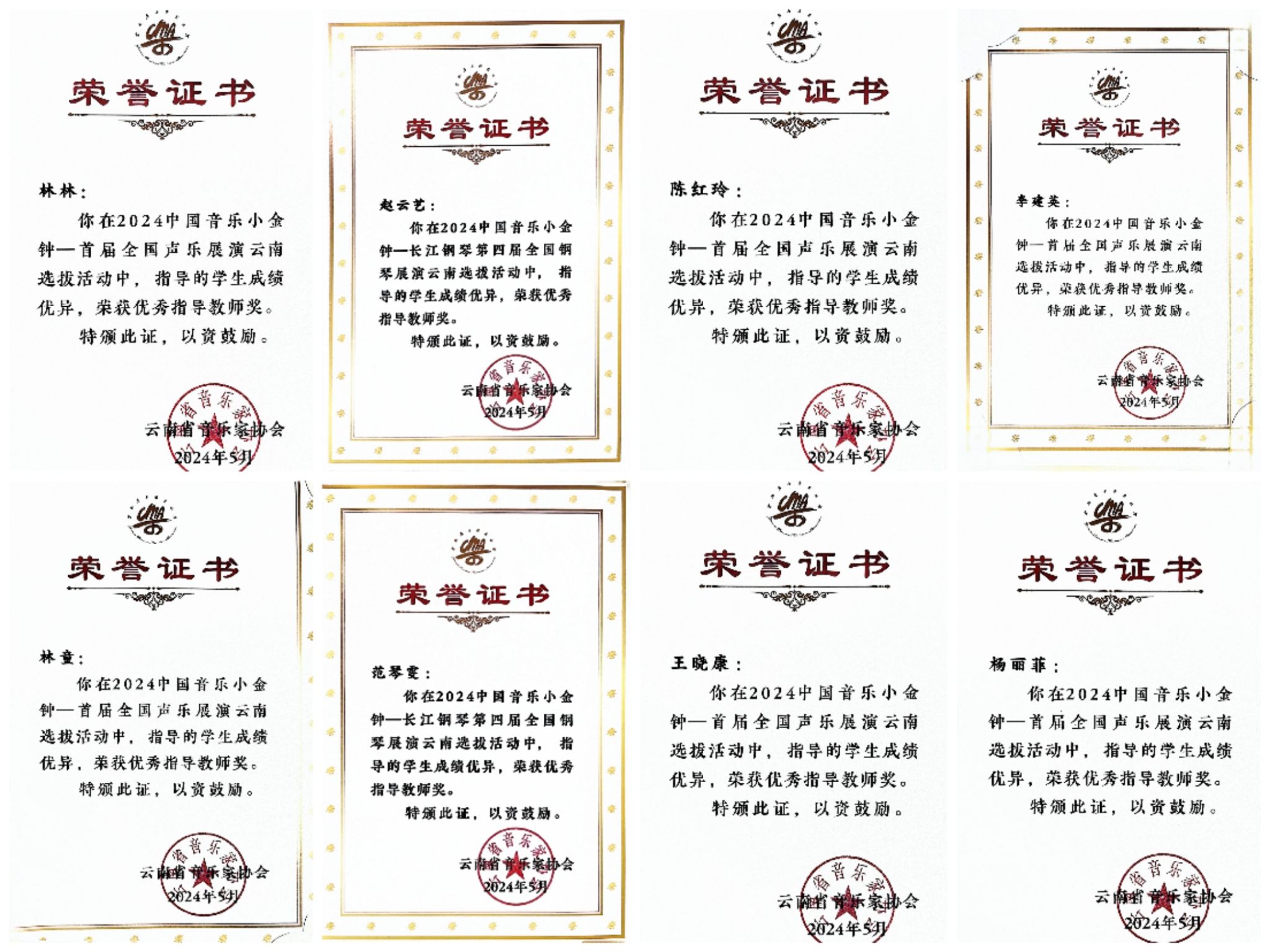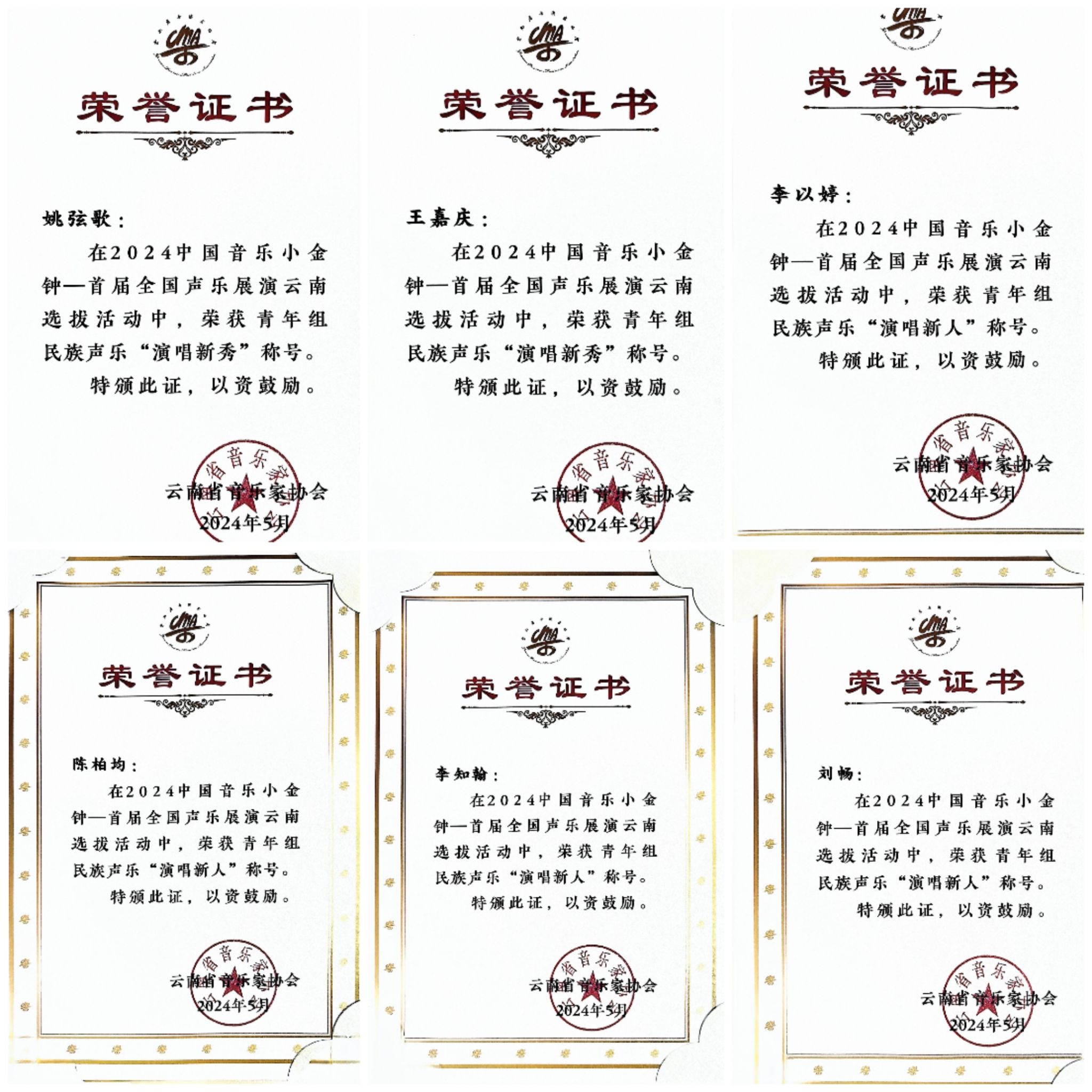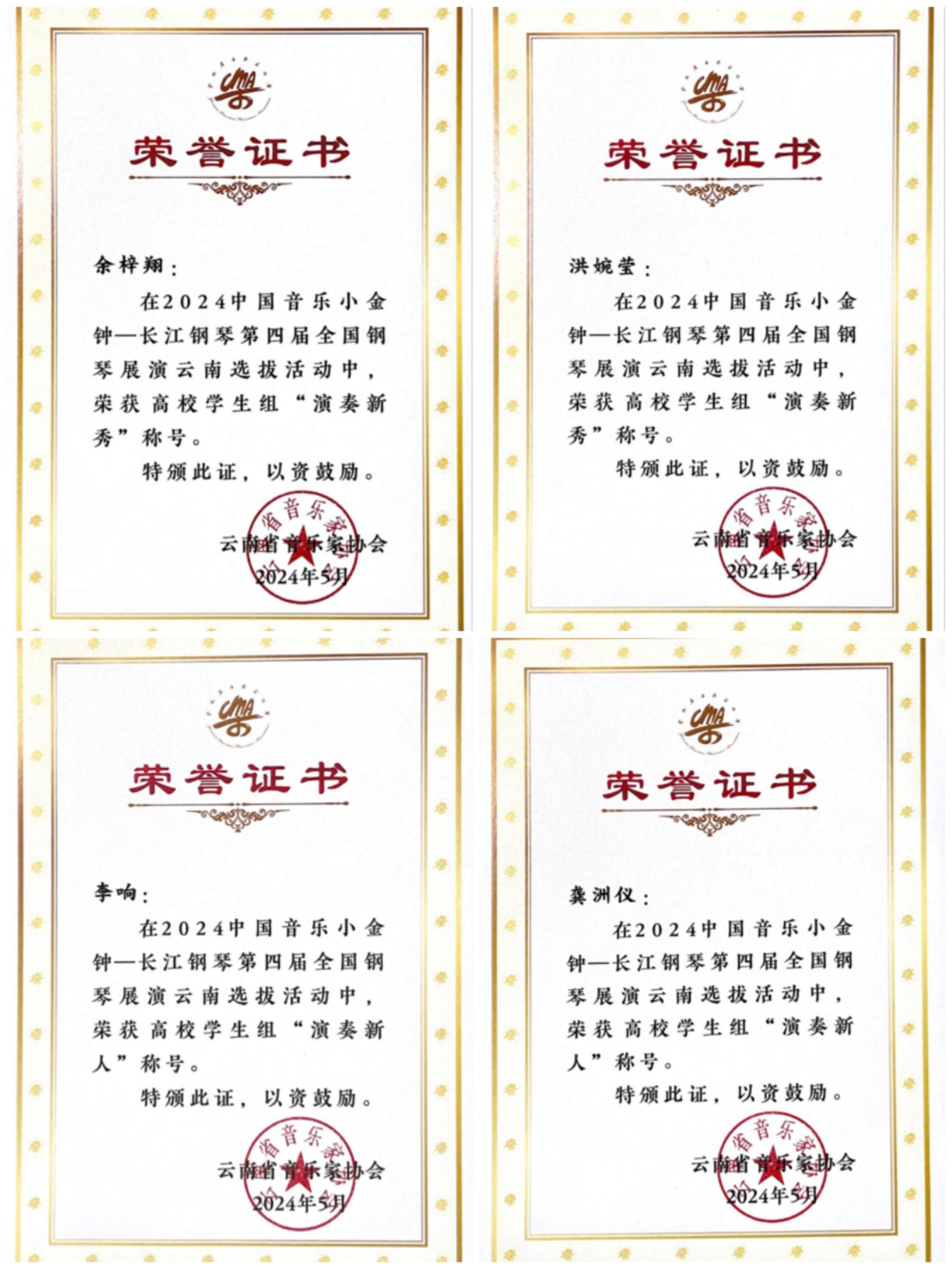 2024年4月27日至28日,由云南省音乐家协会主办的2024中国音乐小金钟——“长江钢琴第四届全国钢琴展演云南选拔活动”和“首届全国声乐展演云南选拔活动”在云南文学艺术馆举办。本次比赛汇集了云南各高校、省级文艺团体以及各地州音乐家协会推选的优秀选手,经过初赛、复赛、总决赛,威廉希尔williamhill共4名员工斩获“演奏新秀”“演奏新人”称号,10名员工斩获“演唱新秀”“演唱新人”称号,8名教师获优秀指导教师。
