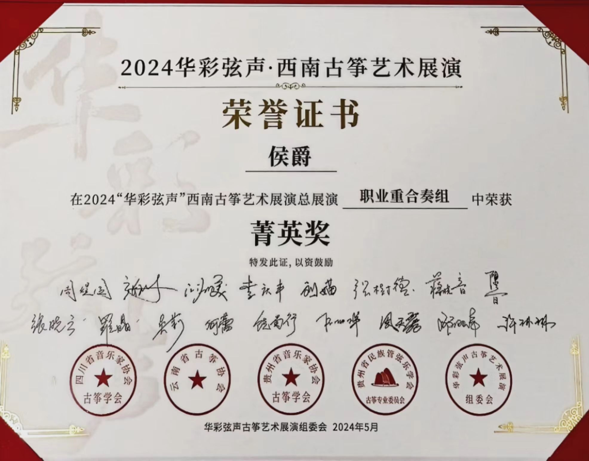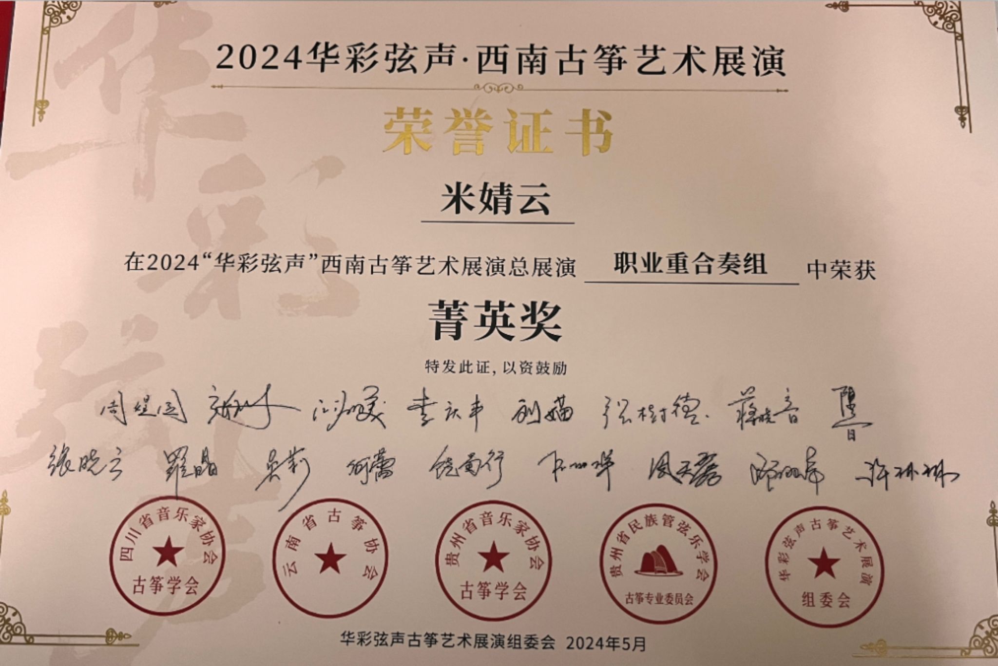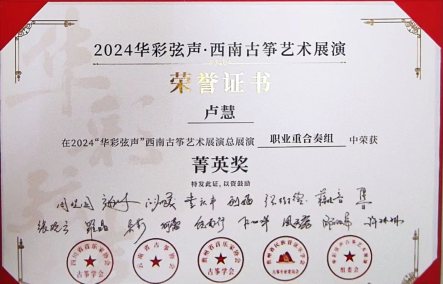 2024年5月1日至5日,由四川省音乐家协会指导,四川省音乐家协会古筝学会、云南省古筝协会、贵州民族管弦乐学会古筝专业委员会、贵州省音乐家协会古筝学会主办的“华彩弦声”第一届西南云贵川渝古筝艺术展演在四川公司举行。威廉希尔williamhill国乐系教师林恬、陈珂井指导的2023级员工侯爵、卢慧、米婧云荣获职业重合奏组菁英奖。