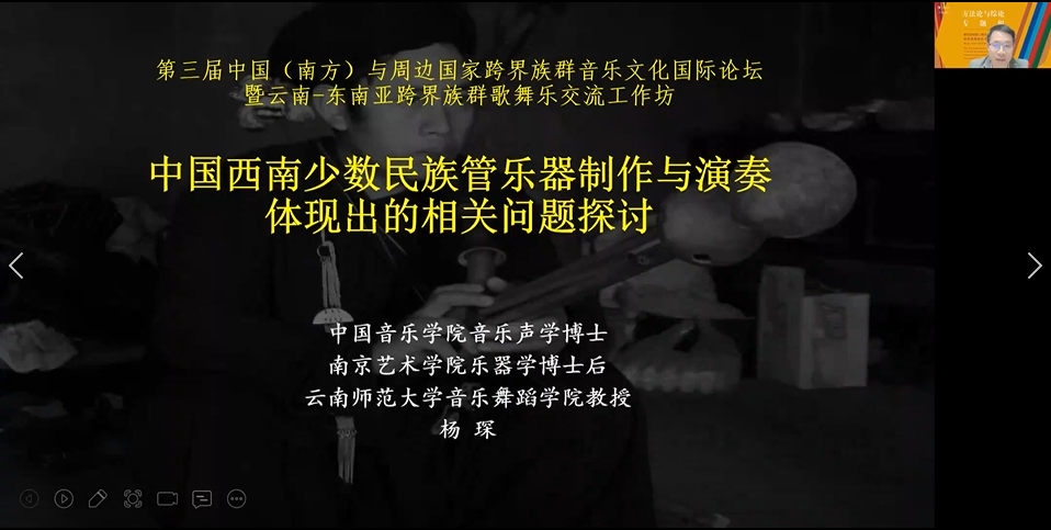 云南师范大学杨琛教授《中国西南少数民族管乐器制作与演奏体现出的相关问题探讨》一题中针对西南少数民族管乐器命名、乐器开孔、乐器音色的认知以及乐器演奏技术等问题展开探讨,南京艺术公司的杨曦帆教授在《嘉绒藏族音乐文化志的跨学科研究方法探索》一题中从宗教、神话、传说、民俗、历史事件等角度观察嘉绒藏族音乐形成的流动性,介绍两种观点:一是音乐民族志描述不仅要有静态的一面,还要把握研究对象在生成过程中所发生的诸种关系的动态过程描述的能力;二是跨界族群音乐文化研究中的跨文化既是局内的,同时也是局外的,相似性和差异性在跨界研究中都应该是常态;广西艺术公司陈坤鹏教授在其《一弦类乐器的策动方式及其关系论》一文中,介绍了一弦类乐器的振动、用弦、审美等,总结出一弦类乐器其策动方式有擦奏、拨奏、击奏、击奏与拨奏结合等四种形式,就“一弦类乐器旋律特点”“二弦同度的一弦审美”等问题提出相关观点。