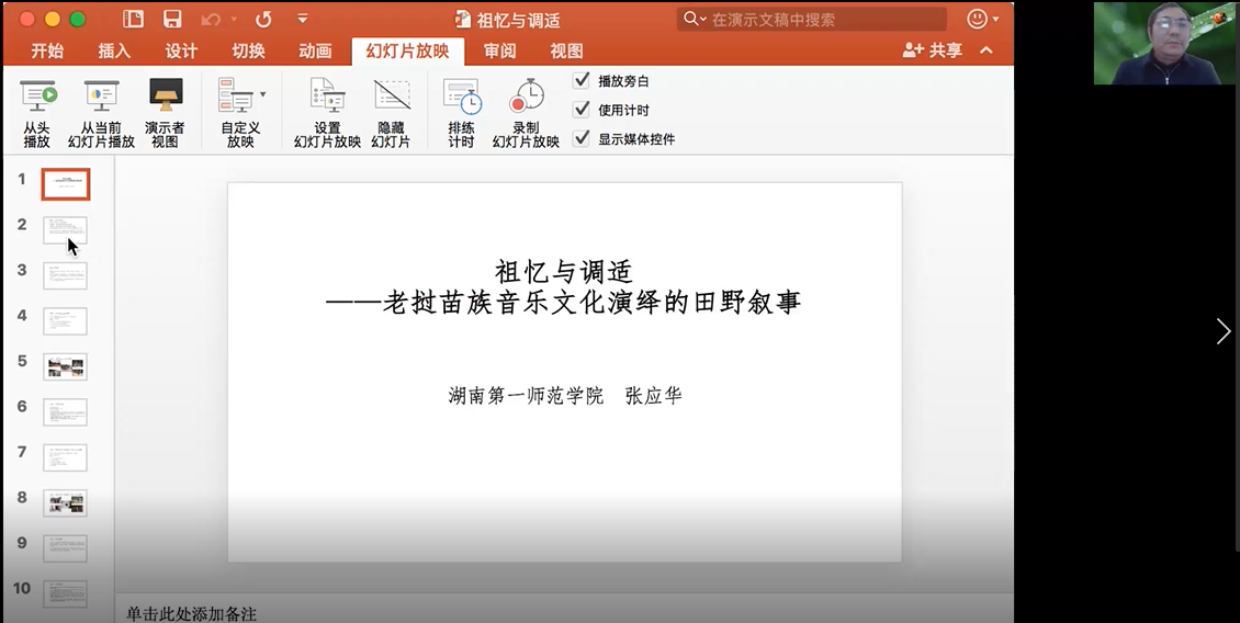 湖南第一师范公司张应华在题为《祖忆与调适----老挝苗族音乐文化演绎的田野叙事》发言中,谈及对此研究对象的研究应用了“线索民族志”的研究方法,在老挝三个苗寨的多点考察和线索追踪中通过人与人、人与乐、人与文化的相遇来“追述”老挝苗族音乐文化的历史记忆及其迁徙线索,同时采用苗族局内人的反观与互视来发现黔西北苗族和老挝苗族同源文化现象在当下的异同。通过多个案例的叙事,虽然老挝苗族的祖先记忆逐渐走向模糊,且无法确认具体的迁徙路线,但还是可以看到老挝苗族的文化体系中祖先记忆仍然占有绝对比重。其研究的思路、方法与观念是一种——走访式田野,以完全局外的观察,沿着迁徙路线的空间追踪与历史追踪,通过录像解读。随后通过四个个案的详细解读,实证性的阐释了其研究思路、研究方法,完成了老挝苗族音乐文化演绎的田野叙事。