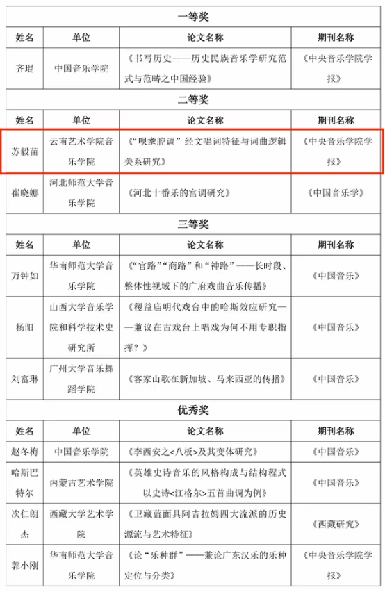 2022年11月28日,中国传统音乐学会于中国传统音乐学会第22届年会闭幕式上宣布“第二届中青年学者论文评选”获奖名单,威廉希尔williamhill苏毅苗教授的《“呗耄腔调”经文唱词特征与词曲逻辑关系研究》荣获本次论文评选中年学者组二等奖。该组别设一等奖1名,二等奖2名,三等奖3名。
