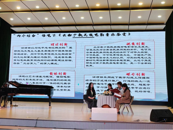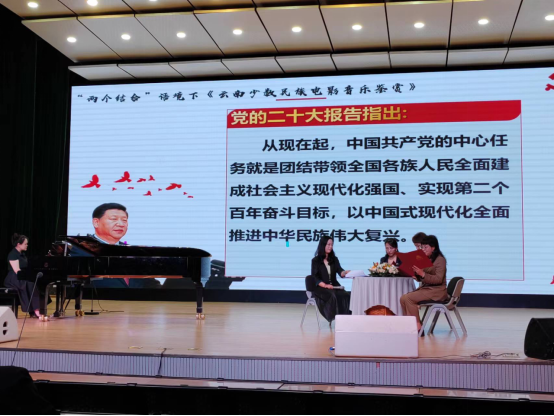 讲座伊始,林林教授向大家介绍了本次讲座的主题,从“党建+思政+艺术”知行耦合的角度,在“两个结合”语境下,以全新的视角重新深刻理解《云南少数民族电影音乐》丰富的时代内涵,在全面提升党建理论水平和音乐素养的同时,立足云南优秀传统文化、面向更大、更高、更远的平台讲好中国故事云南篇章。