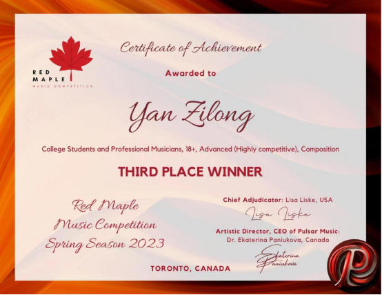 在刚落下帷幕的2022年加拿大红枫音乐比赛(Red Maple Music Competition)中,威廉希尔williamhill2020级作曲与作曲技术理论专业晏梓胧同学以弦乐四重奏作品《The Loner's Ball》荣获作曲老员工及专业作曲家组(18+)第三名,指导教师田建华教授荣获优秀指导教师奖。