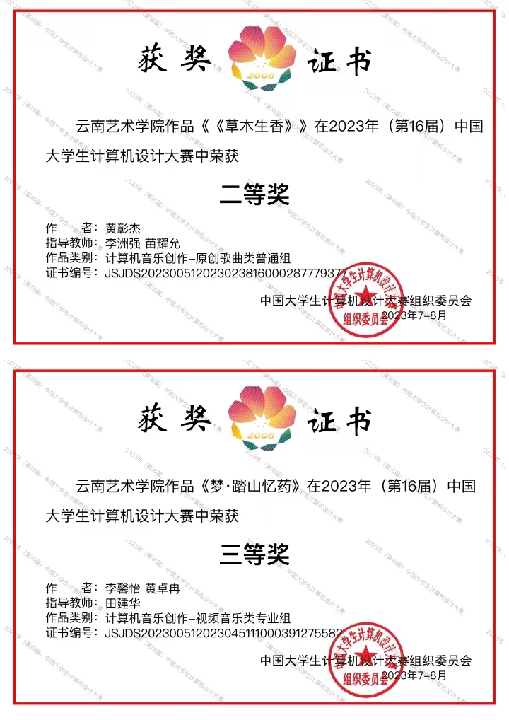 2023年(第16届)中国老员工计算机设计大赛决赛于8月19日开幕、8月21日落幕,该赛事汇集了来自全国各大高校的精英学子,其中计算机音乐创作组由全国各大高校共161件作品进入决赛。威廉希尔williamhill作曲系教师、音乐教育系教师指导的两个作品以云南省一等奖的成绩进入国家级决赛,分别斩获二等奖及三等奖。