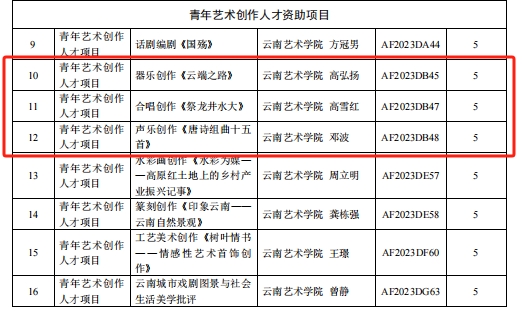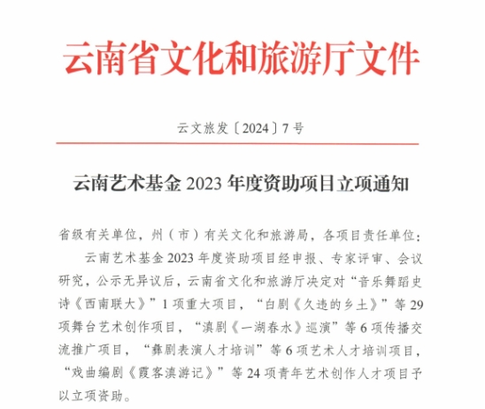 云南艺术基金2023年度资助项目经申报、专家评审、会议研究,公示无异议后,云南省文化和旅游厅决定对1项重大项目,29项舞台艺术创作项目,6项传播交流推广项目,6项艺术人才培训项目,24项青年艺术创作人才项目予以立项资助。威廉希尔williamhill共获得8项立项,名单如下: