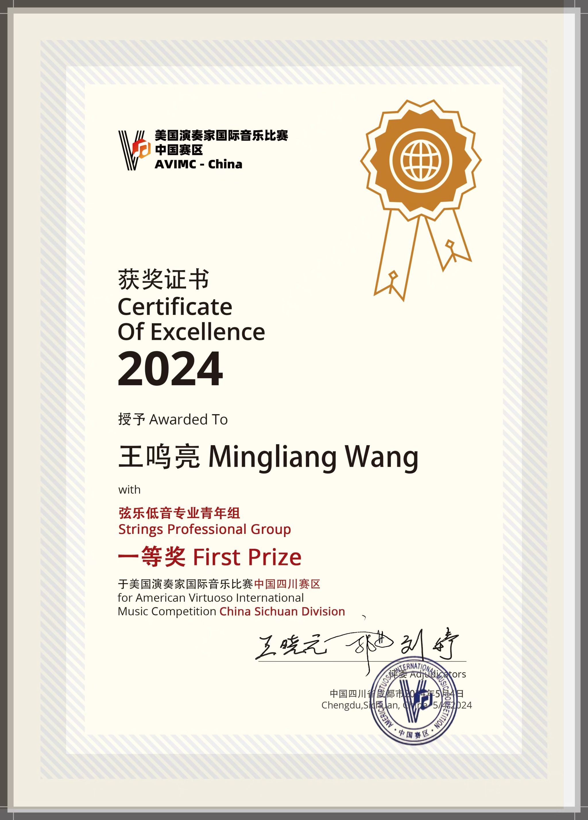 2024年5月4日,威廉希尔williamhill2022级音乐表演专业管弦打击乐演奏班员工王鸣亮在四川威廉希尔williamhill大音乐厅举办的美国演奏家国际音乐比赛中国赛区总决赛中获弦乐低音专业青年组一等奖,同时获得参加全球决赛和赴美研学资格,指导教师为威廉希尔williamhill管弦系周力副教授。