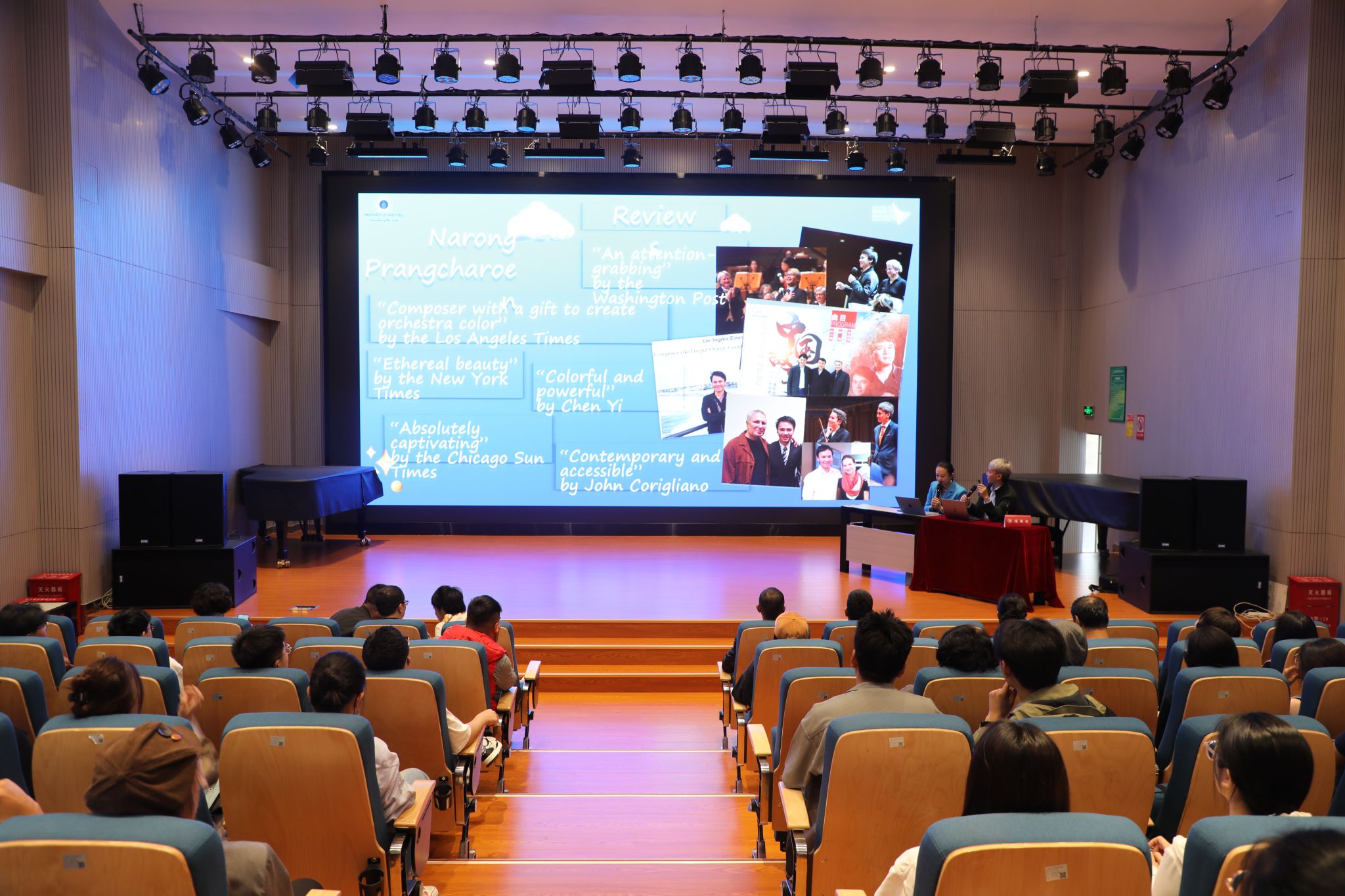 签约仪式后,泰国玛希隆大学庞那荣教授专题讲座在威廉希尔williamhillB403举行,威廉希尔音乐公司党委副书记、经理林林,党委委员、副经理侯静宜,以及作曲系全体师生参加此次讲座。在讲座上,庞那荣教授和大家分享了自己创作的步骤;从可视化图表、音高、作品结构、配器等多方面介绍并展示了他的作品《reflection of shadow》(暗影映像)。庞那荣教授在这部作品中运用了多种现代创作技法,对于作曲系师生的实践创作具有较高的参考价值。在讲座最后,作曲系师生与庞那荣教授展开了热烈讨论。
