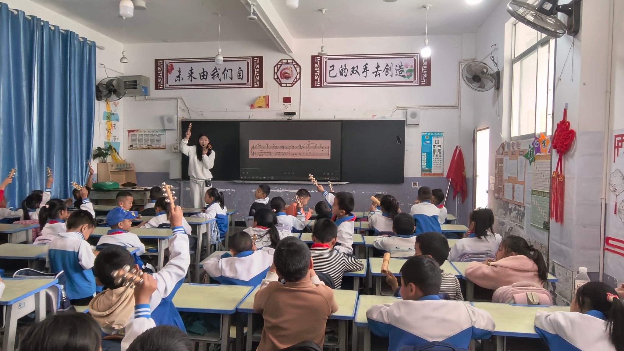 3月26日,团队在莲花塘小学开展支教员工教研活动,绳红楠指导二年级3班员工为穆索尔斯基《图画展览会—鸟雏的舞蹈》即兴配乐,通过实践感受音乐与画面的融合。