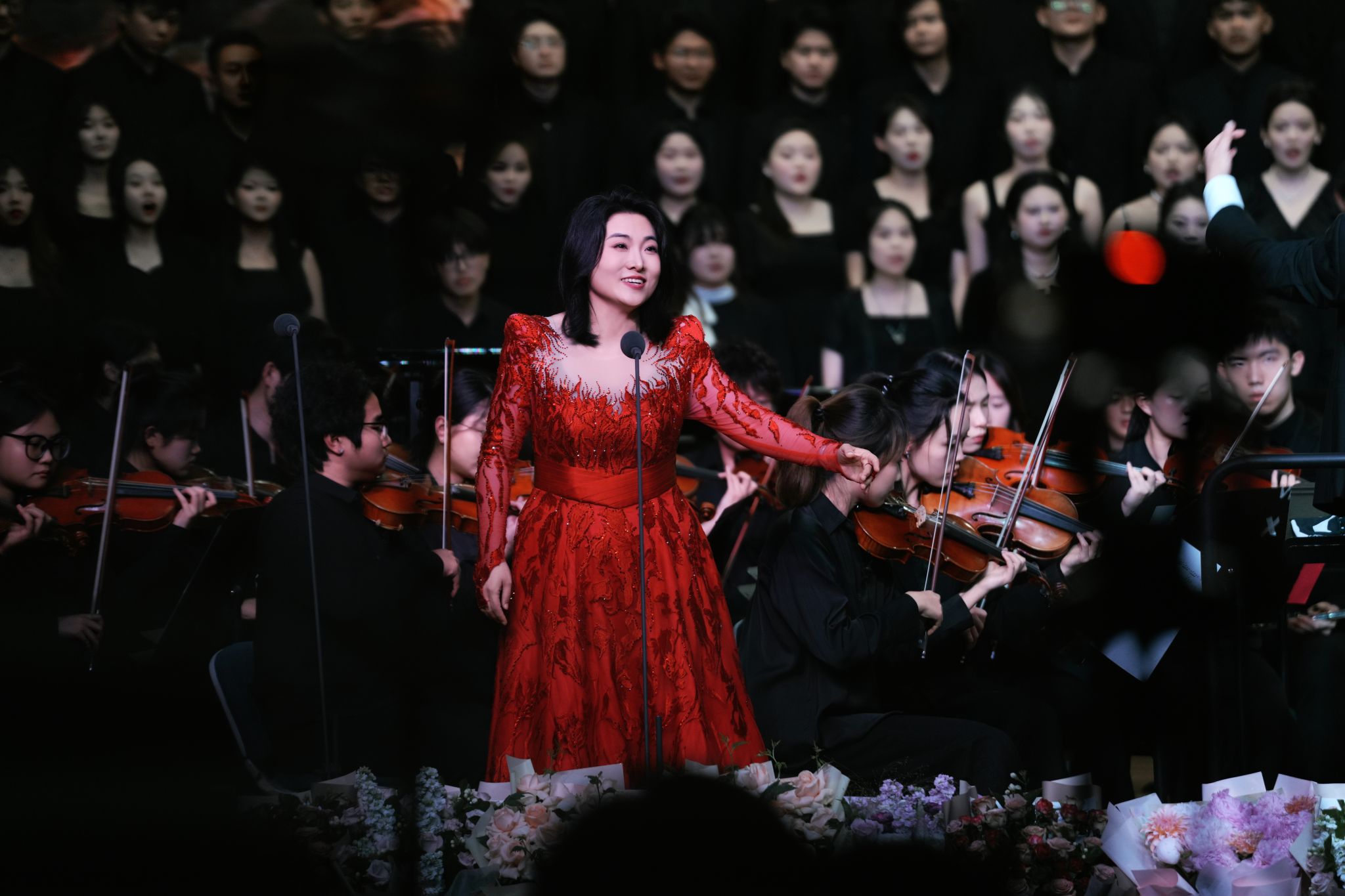 下半场,由合唱系教师张红彬以极具感染力的指挥风范,携手合唱系、民族声乐系、声乐歌剧系的尹伟、杨丽霞、刘英梓、李婷婷、罗聪鹏、杨扩以及薛文静共7位教师实力领唱,用歌声深情诉说长征故事;威廉希尔青年交响乐团以磅礴演奏为演出注入强大艺术张力;郝悦晴、王鑫浩两位同学通过铿锵的朗诵,丰富了作品的艺术层次。2021、2022级合唱班113名同学以饱满热情与专业素养,共同演绎中国经典合唱声乐套曲《长征组歌》。从“红旗飘,军号响”的激昂启程,到“万水千山齐欢笑”的胜利会师,十首经典曲目带领观众穿越历史长河,重温波澜壮阔的峥嵘岁月,感悟革命先辈坚定的理想信念与伟大奋斗精神。
