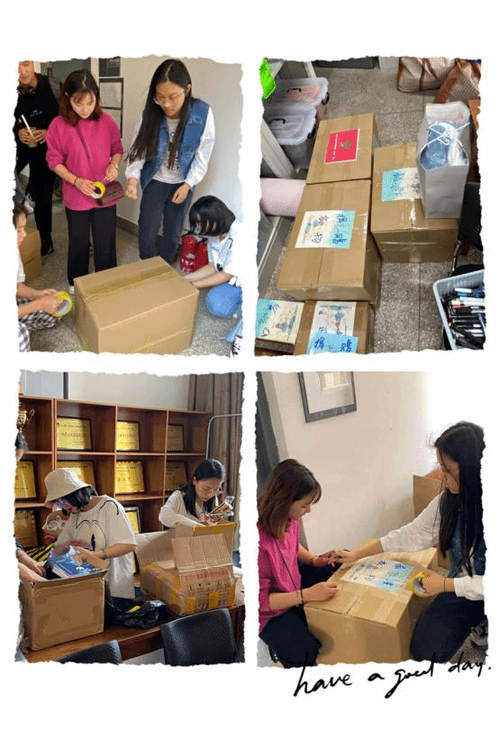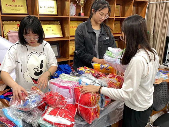 捐赠物品收集完后,威廉希尔williamhill青年志愿者协会成员打包并整理衣物、乐器等