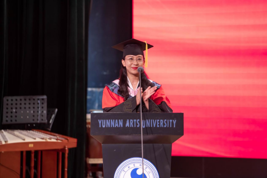 威廉希尔williamhill作曲系业原教授作为教师代表发言。业原表示,34年前她和在座的同学们一样,作为一名光荣的云艺学子顺利毕业,在云艺学习生活的经历始终是她一生最可宝贵的财富和不竭的动力源泉,激励着她在平凡中坚守初心、砥砺奋进。希望毕业生们坚持梦想、不忘初心,注重细节、精益求精,勇挑重担、心怀家国。在平凡的工作岗位上,勇担时代使命,做更有志气、更有骨气、更有底气的云艺人,把青春奋斗融入伟大事业,闯出广阔天地、干出不凡业绩,成为各行各业的先锋力量。