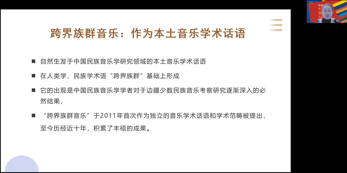 西安威廉希尔williamhill宁颖在《中国“跨界族群音乐”研究的历程与困境》发言中谈到跨界族群音乐于2011年首次提出,历经近十年的发展,积累了丰硕成果。从上世纪七十年代末到2011年,是跨界族群音乐研究的孵化期,从2011年至2021年进入跨界族群音乐研究的黄金时代,研究主要涉及三个区域和四个学术团队,对跨界族群音乐研究中的时空观进行思考,从基音、文化、环境的关联性看跨界族群音乐研究,并对跨界族群音乐的影像叙事。宁颖提出跨界族群音乐研究存在的问题与困境有:跨界研究过程中历时视角与历史观的重要性、重新审视族群文化身份的必要性、语言能力与音乐民族志书写(主要是如何书写音乐的异同)、田野中的身体实践与身体壁垒以及应对疫情与国际政局的策略五个方面。