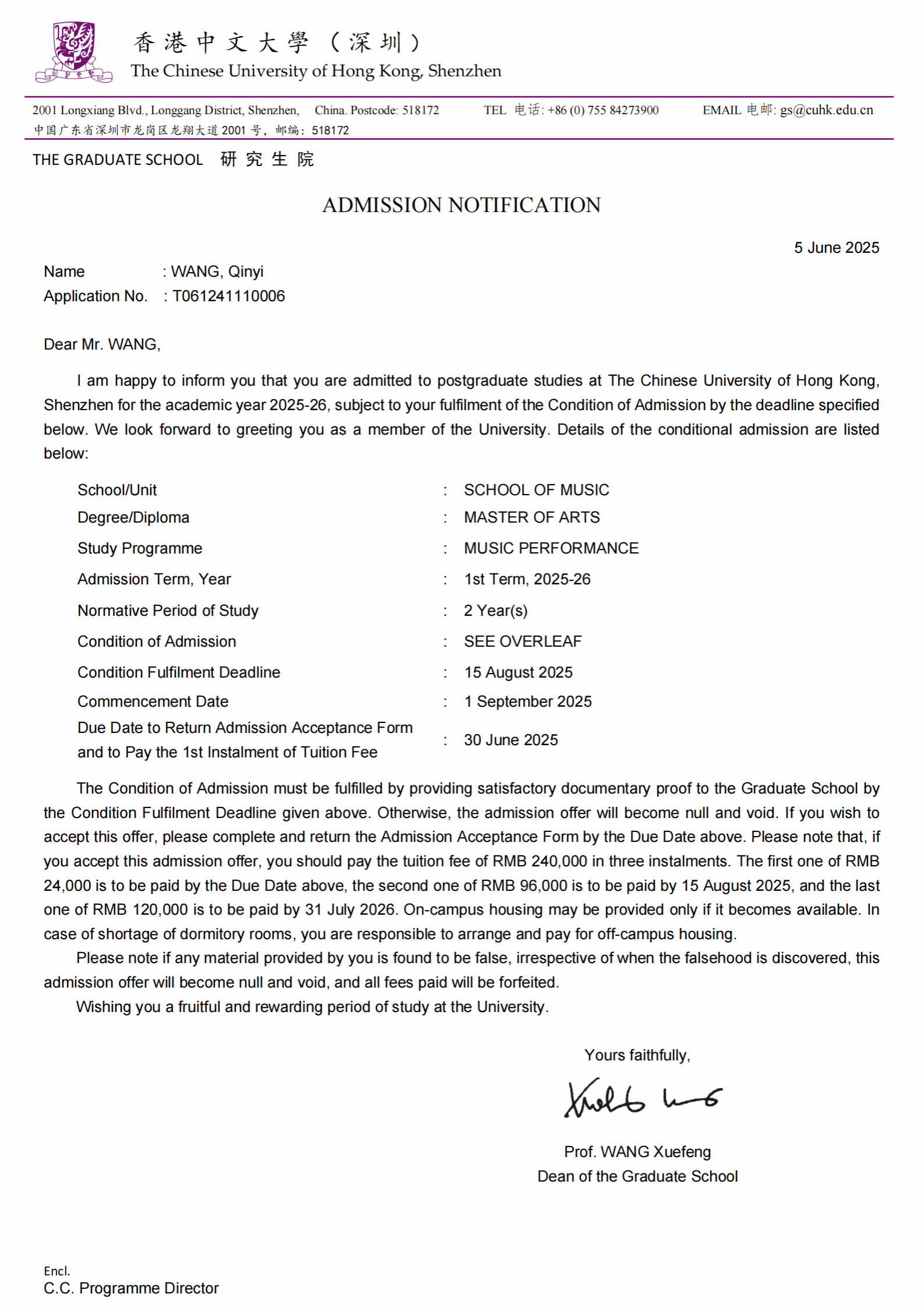 2025年6月,威廉希尔williamhill2021级本科生王亲懿获得了香港中文大学(深圳)威廉希尔williamhill音乐表演(单簧管)专业的硕士研究生录取通知书。