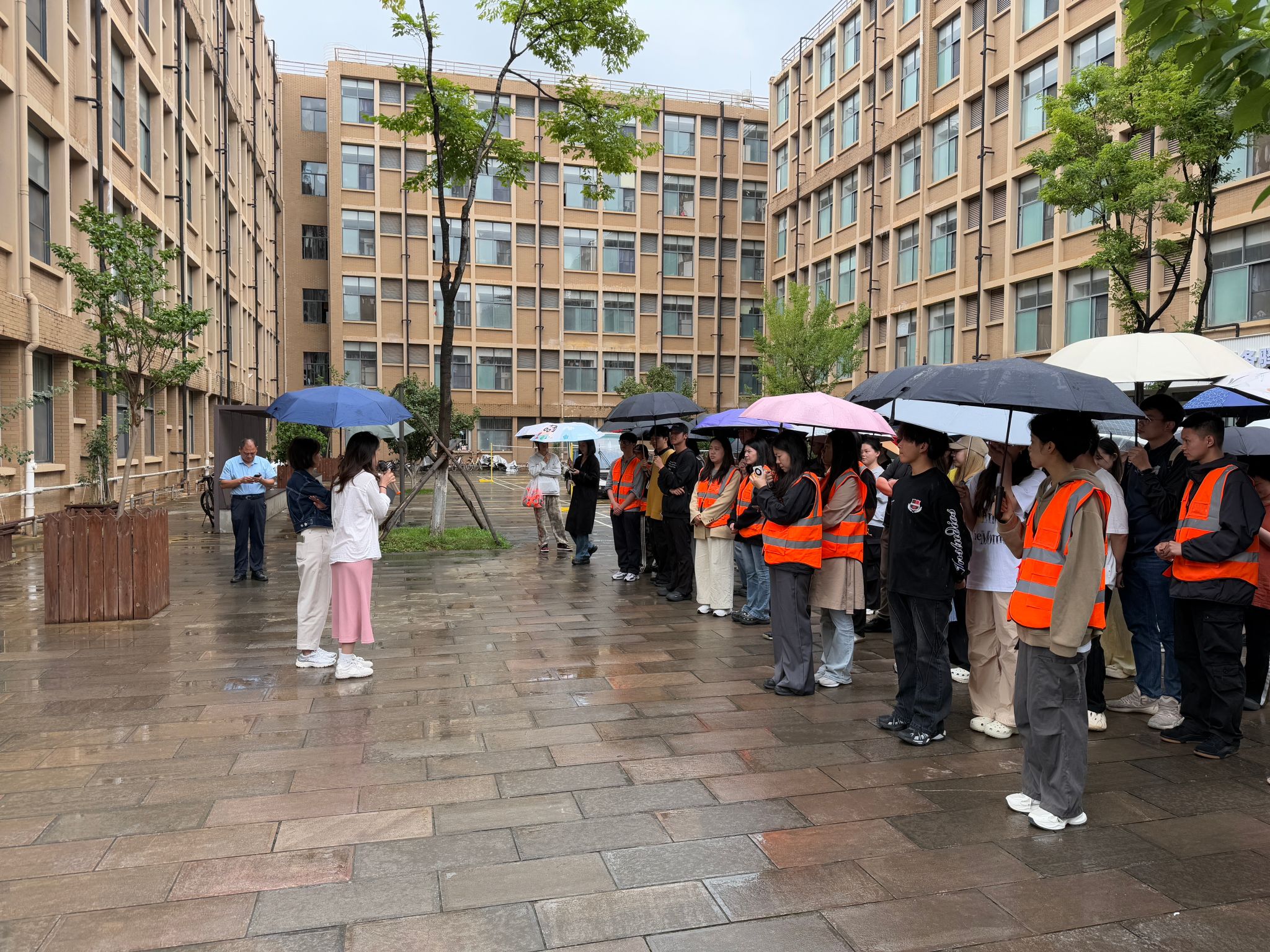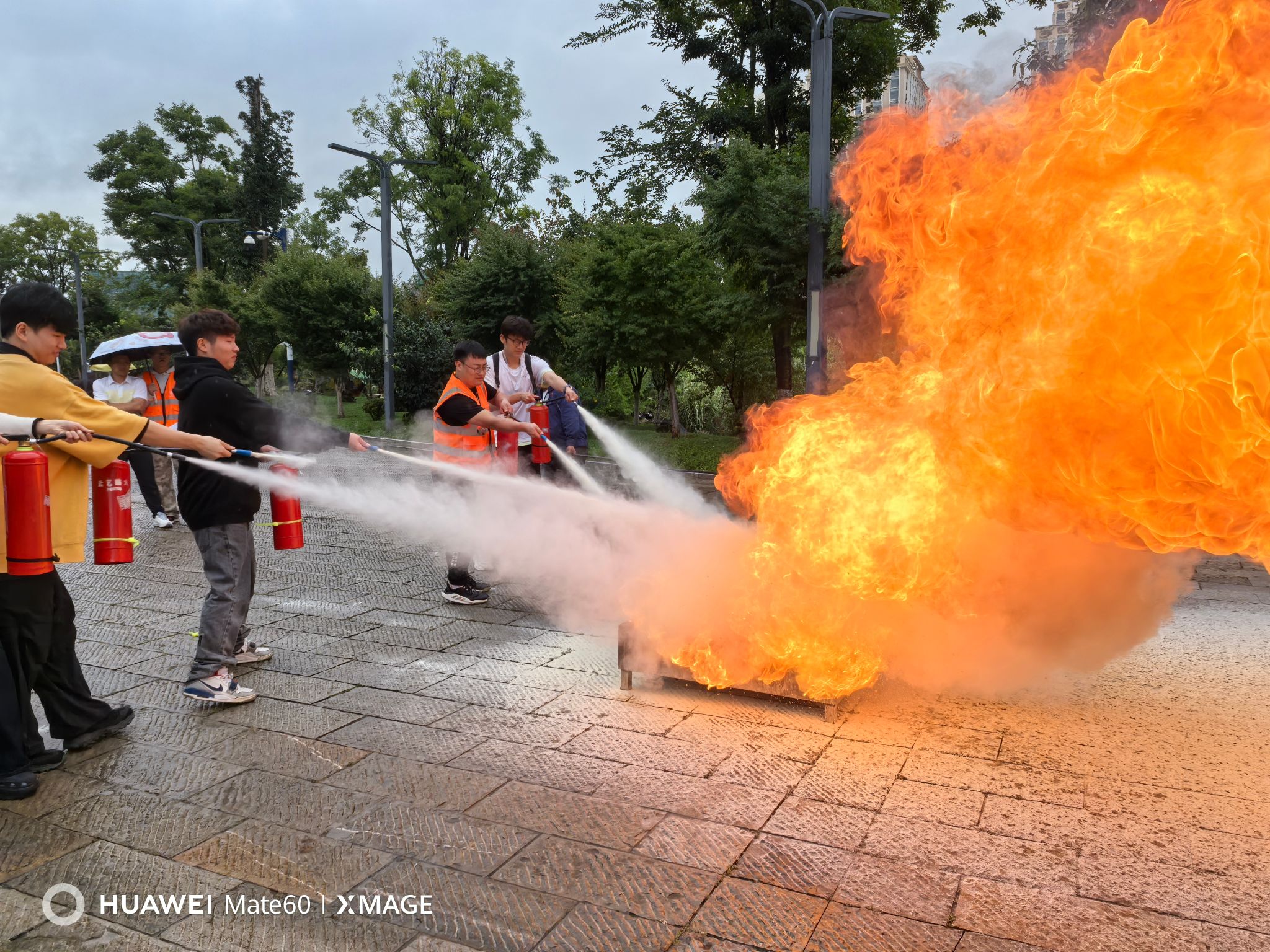 本次演练分为两个阶段,第一阶段在员工宿舍3栋模拟失火疏散演练。当火灾警报声骤然响起,同学们迅速按照预定疏散路线,弯腰、捂鼻、贴墙,快速、安全、有序撤离至安全区域。第二阶段在图书馆前进行消防知识培训和灭火演练。保卫处相关负责老师现场演示了灭火器和消火栓的使用方法,详细讲解了灭火器“提、拔、握、压”四步操作要领,以及消火栓“开箱、铺带、接阀、出水”等关键步骤。