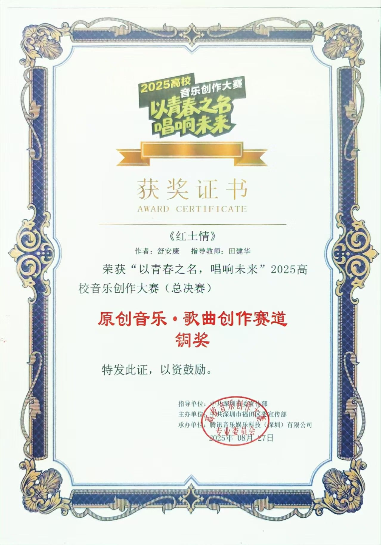 由中共深圳市委宣传部指导,福田区委宣传部主办,腾讯音乐娱乐科技(深圳)有限公司、QQ音乐、酷狗音乐联合承办的“以青春之名·唱响未来”2025高校音乐创作大赛于今年4月底启动,8月27日落幕经过激烈角逐,公司学子在省级比赛中斩获14个奖项,包括一等奖1项、二等奖7项、三等奖6项,获奖总数位列西南高校前列。其中,作曲系2025级研究生舒安康同学凭借作品《红土情》荣获省级一等奖,并晋级全国总决赛,最终荣获全国三等奖。