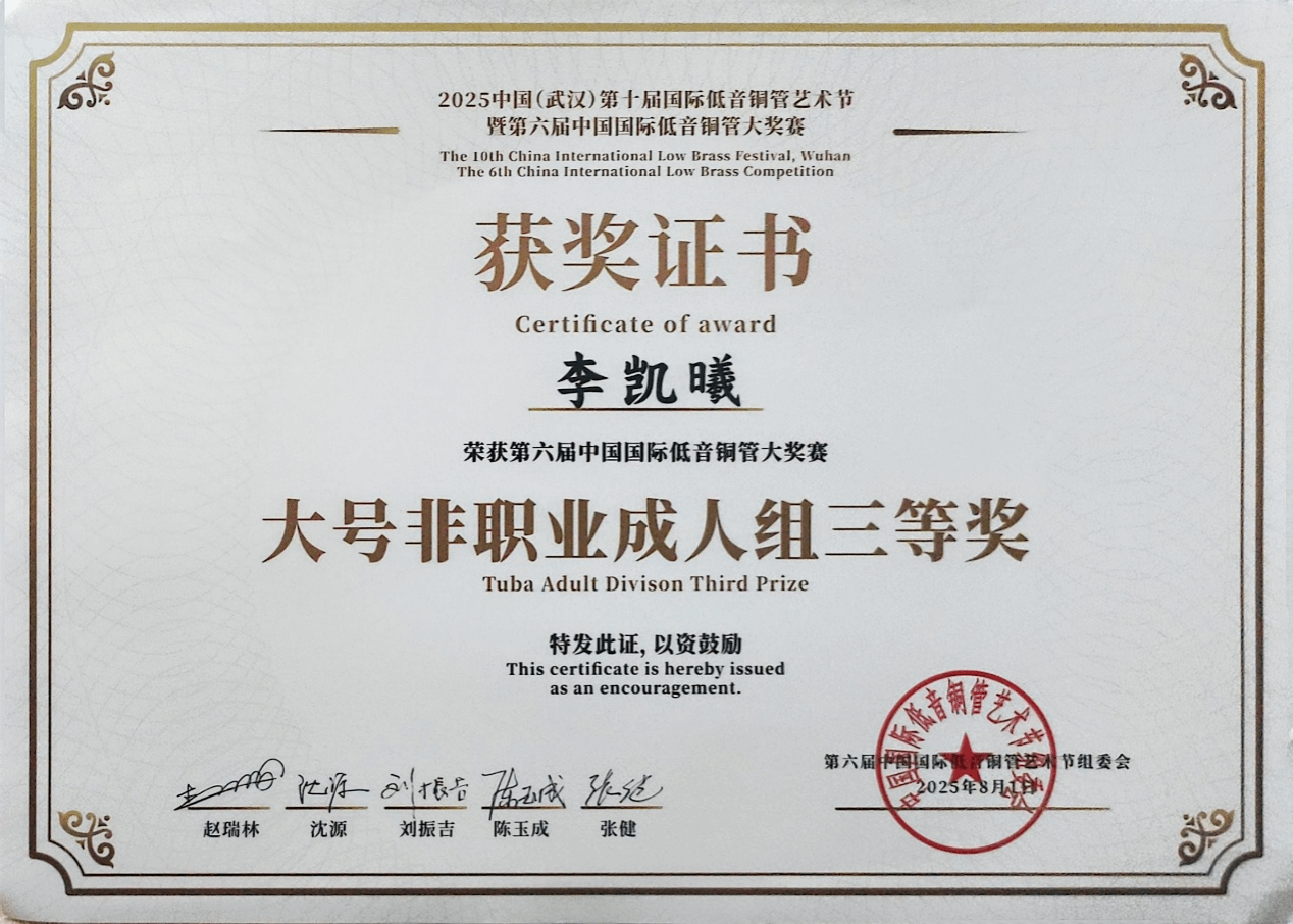 2025年第六届中国(国际)低音铜管大奖赛是第十届中国(武汉)国际低音铜管艺术节的核心赛事,于2025年7月31日至8月1日在武汉东西湖区临空港艺术中心及临空港大剧院举行。该赛事由中国乐器协会管乐专业委员会主办,武汉临空港保利大剧院有限公司协办,中国音协管乐学会低音铜管专业委员会指导,旨在推动低音铜管艺术发展并促进国际文化交流。威廉希尔williamhill管弦系2022级管弦打击乐演奏班员工李凯曦进入决赛,获得非职业成人组三等奖(指导教师:赵华)。